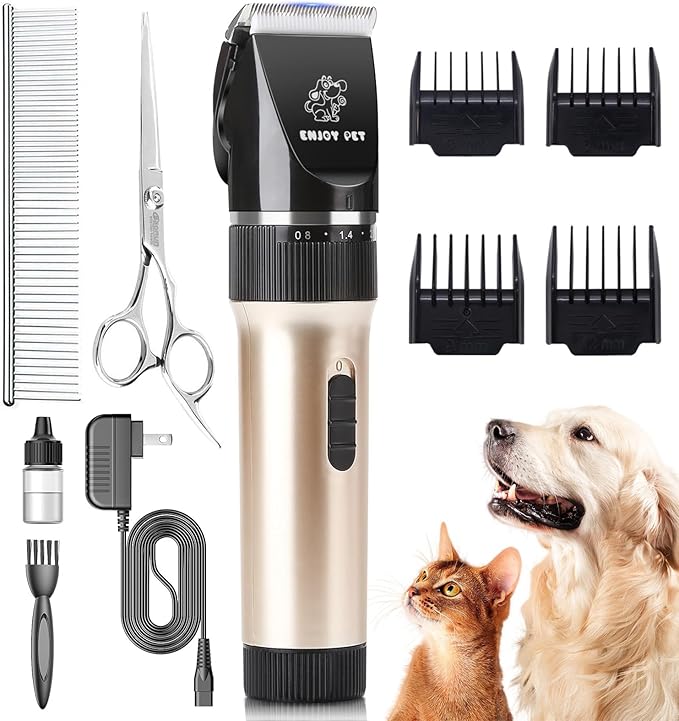 - Dog Grooming Kit - The 24-tooth titanium ceramic blades in the ENJOY PET dog clippers for grooming provide durability, sharpness, and reduced heat generation to protect pets from burns during clipping. Our dog clippers grooming professional are easy to use. Pet clippers offer 5 adjustable blade settings to accommodate pets with various hair lengths, ensuring a smooth, jam-free cut every time