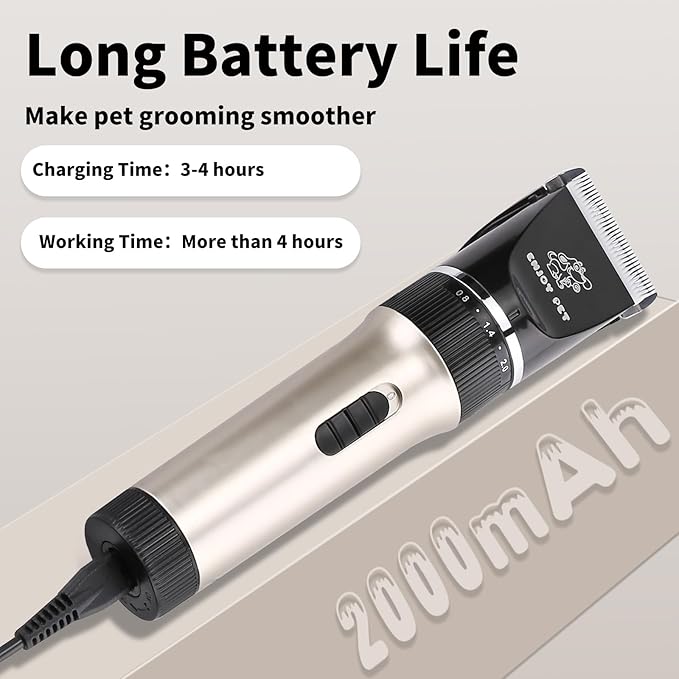 - Low Noise Dog Hair Clippers - ENJOY PET understands that some dogs and cats can become anxious due to the loud noise of pet clippers. To avoid this, our dog grooming clipper features a low-noise motor at 50 dB, helping pets feel at ease and eliminating their fear of grooming. With our electric clippers for dogs, your pets can enjoy a comfortable grooming experience