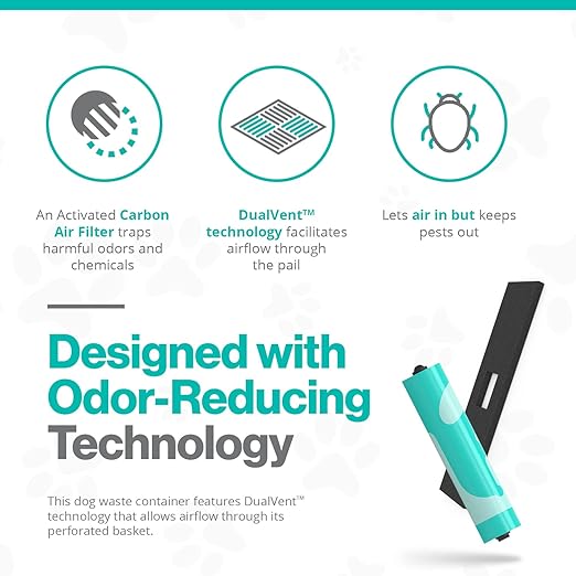 - Dual Odor Control Technology: Activated carbon filter and DualVent airflow work together to reduce odors inside this dog waste trash can; ideal for keeping patios, walkways and entry areas fresher between cleanups