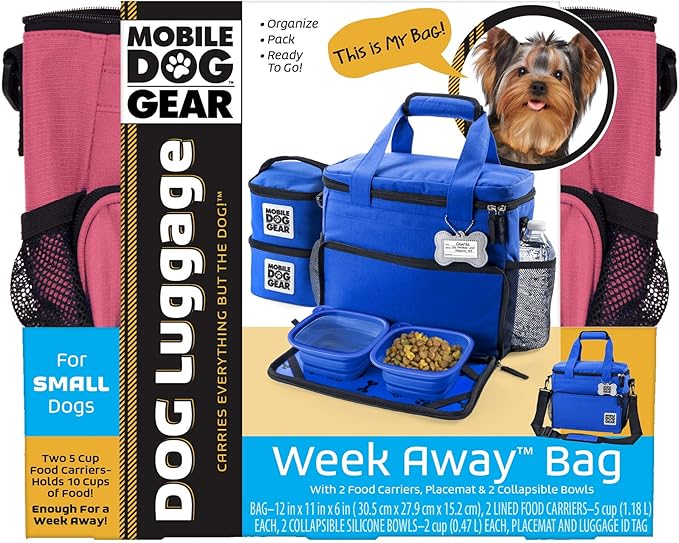 Mobile Dog Gear, Week Away Dog Travel Bag for Small Dogs, Includes Lined Food Carriers and 2 Collapsible Dog Bowl, Pink