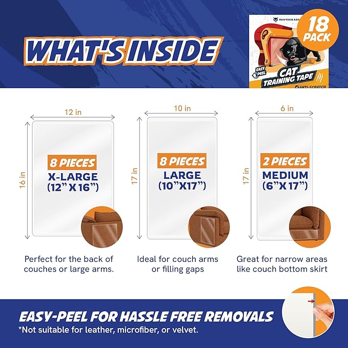 18 Pack Cat Scratch Furniture Protector Tape Sheets – Double-Sided Sticky Training (8 XL, 8 Large, 2 Medium) – Anti-Scratch Couch & Sofa Guard – Clear – Not for Leather, Velvet, Microfiber