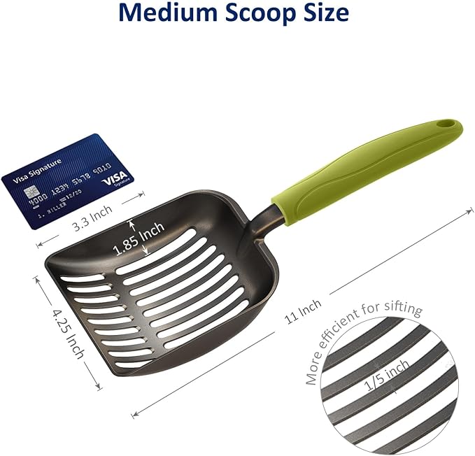 - [Premium Material]: To lift your concern about cat's waste sticking to the scooper, We updated our scooper's coating by using food-grade non-stick design, which makes cleaning easier and faster. Tip-- For better non-stick effect, spraying edible oil (EG, Pam spray oil ) on the scooper's surface is recommended.