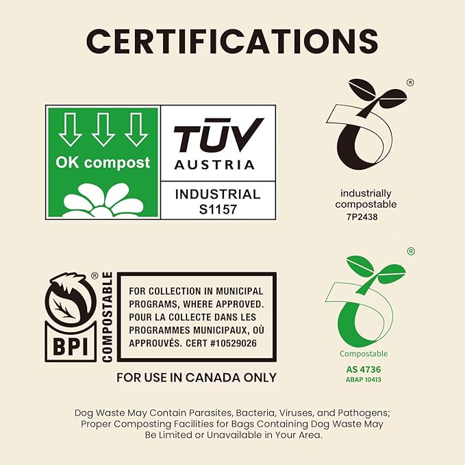 - Certifications: SUPERBIO bags has been awarded official certificates from BPI (for use in Canada only and commercially compostable only), OK compost INDUSTRIAL and SEEDLING from TUV, meeting both the ASTM D6400 standard and the EN 13432 standard.