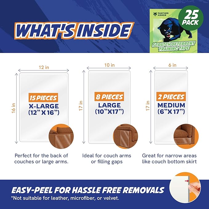 25 Pack Cat Scratch Furniture Protector Tape Sheets, Double-Sided Sticky Training (15 XL, 8 Large, 2 Medium), Anti-Scratch Couch & Sofa Guard, Clear, Not for Leather, Velvet, Microfiber
