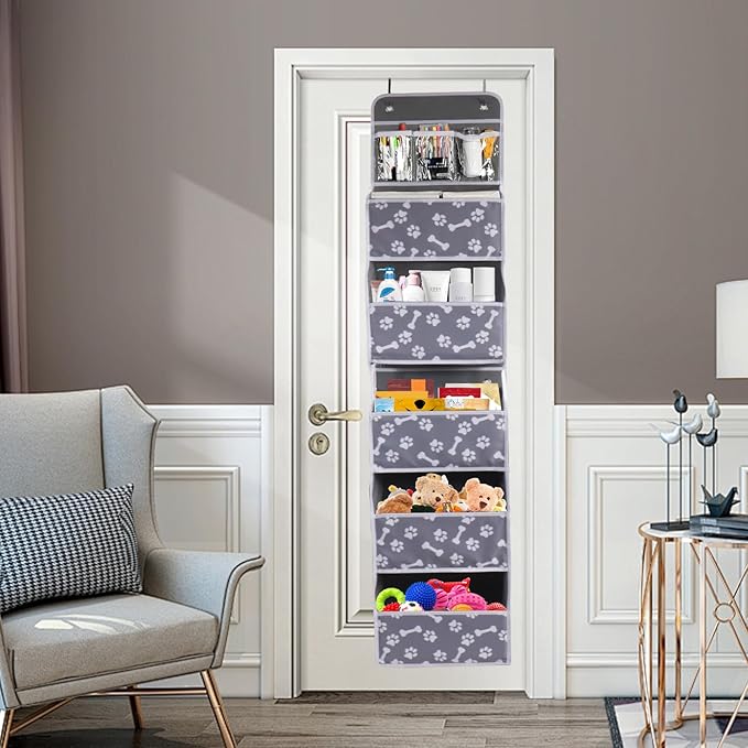 - 1.Dog Toy Basket: The 5-shelf over the door organizer for pet toys has an extra-large size, 13.5"(L) x 5.5"(W) x 63"(H), Contains 5 extra large pockets for storing various pet supplies,such as toys,leashed,harness, snacks,blanket,collars,grooming supplies.