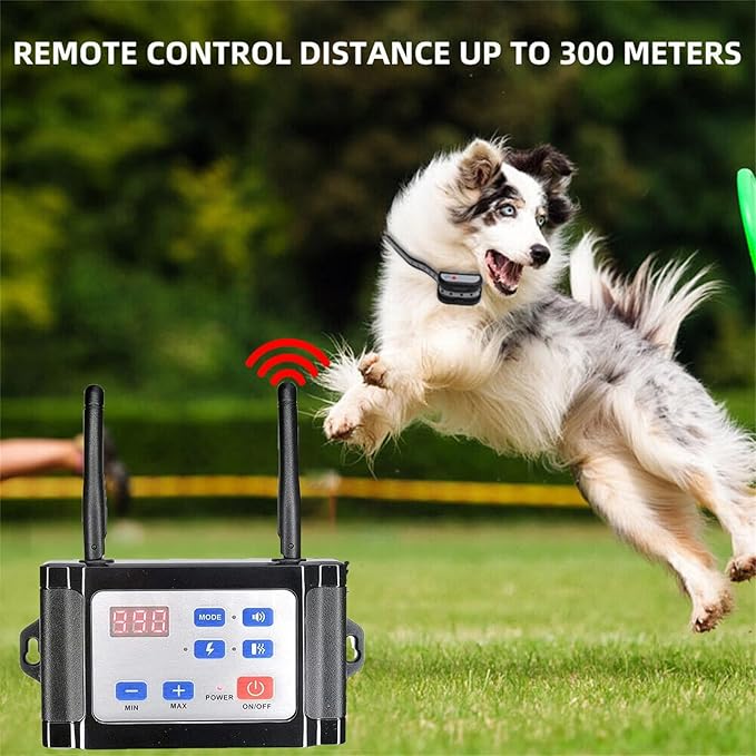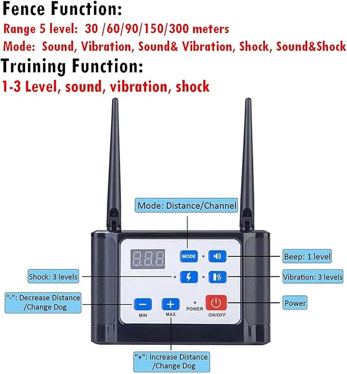 - 1.Remote control dog trainer and wireless electronic fence combo - remote control dog training collar system combined with wireless dog fence system.LED display for 5 different control radius distances: 100ft, 200ft, 300ft, 500ft, 900ft.