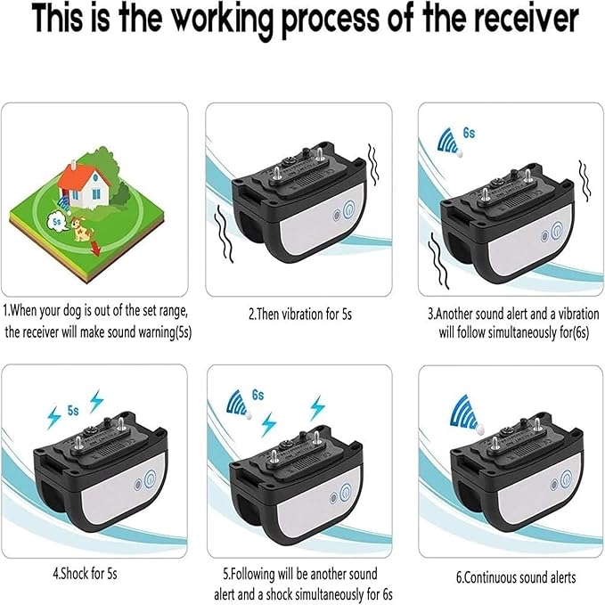 - 3.Eco-friendly,Waterproof,Safe&Adjustable Collar:The collar is made of eco-friendly TPU material and will dissolve into powder finally. The outer layer is equipped with a reflective belt to keep your dogs safe at night.The receiver is IP65 dust-proof and IPX7 waterproof and can be used in the rain and wet environments.