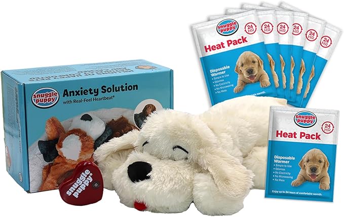 - DOG ANXIETY SOLUTION: The Motion Activated Real-Feel Heartbeat and 3 Overnight Heat Packs work to alleviate your dog’s anxiety and promote a sense of calmness. Snuggle Puppy PLUS is the PREMIUM solution for dog separation anxiety, fear of loud noises, and crate training new puppies. It helps ease transitions, reduces stress, helps puppies sleep through the night. The Snuggle Puppy Plus is a new dog owner essential and it makes a great dog gift!