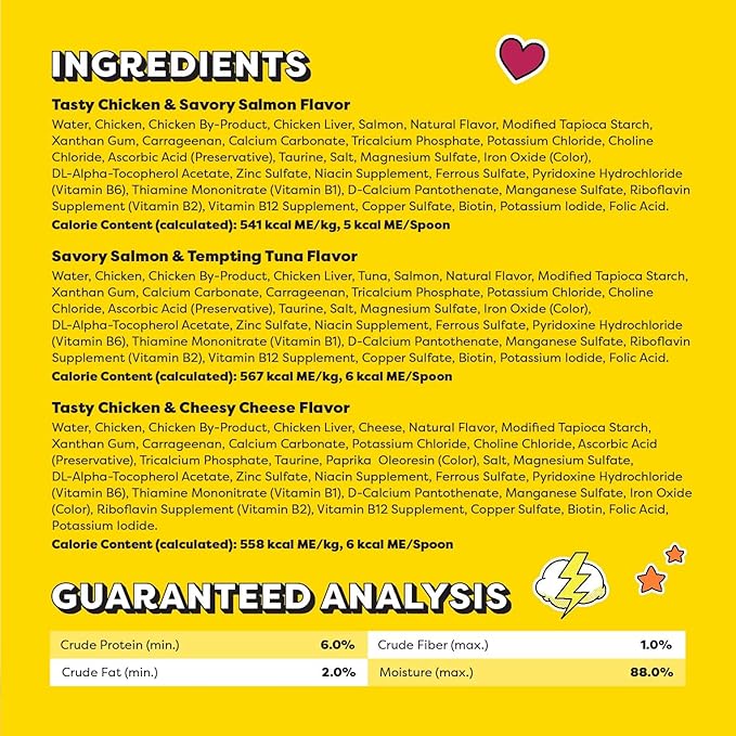 - Made with real chicken, tuna, salmon or cheese so your favorite feline will enjoy two irresistible flavors in one lickable spoon.