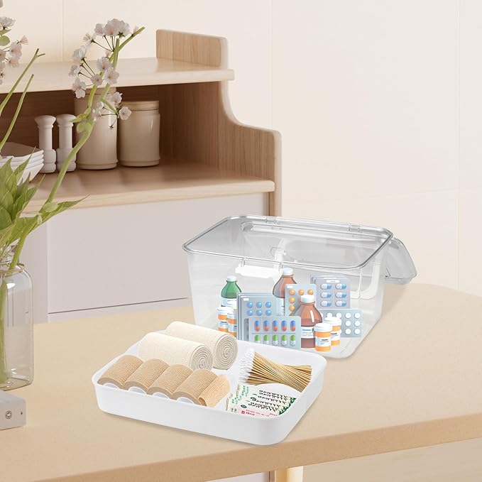 - 2.Double Layer Design-The first aid kit is designed with insert divider tray to store scattered drugs, thermometer, cotton bud, bandages, ointments, wipes, swabs, tweezers, and more. Neat and clear, easy to find. The lower layer can be placed the big bottle and is big enough to store various specifications drugs. Classify your pills with the 3 compartments dividers. This medicine box holder divider is removable.