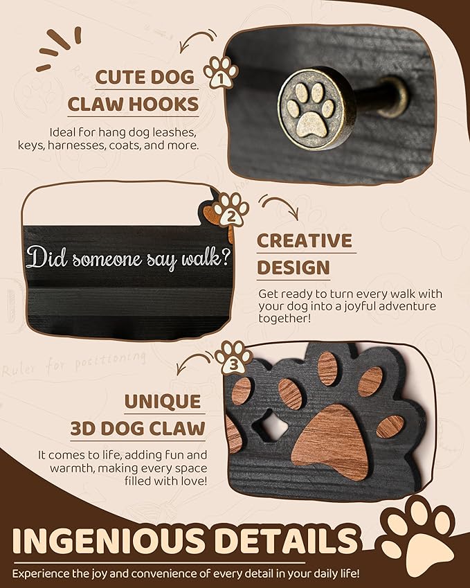 - [SUPER PRACTICAL] This isn’t just a cute stuff – it’s a practical organizer for your apartment essentials! With 6 sturdy 3D dog paw hooks (1.5 inches), it is perfect for hanging small dog leash, dog poop bag, and more. Plus, it doubles as a coat rack wall mount for scarves and coats. Say goodbye to clutter and hello to organized bliss!