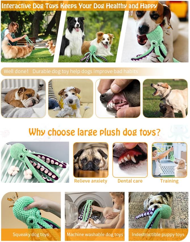 - 【PLUSH & DURABLE DOG TOYS OCTOPUS DESIGN】Made from upgraded, thickened fabric and soft plush for long-lasting use. Our dog toys octopus design is realistic and fun, helping relieve stress and boredom. Ideal for everyday play, training, and cuddling.