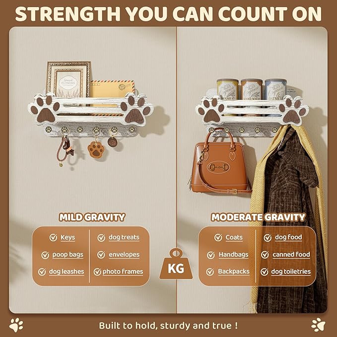 - [DESIGN FOR PET LOVERS] Delight in the cute dog paw prints that bring a playful charm to your room decor! Designed with dog lovers in mind, this key holder for wall adds warmth and personality while keeping home essentials organized. Its unique paw-shaped accents create an eye-catching touch perfect for entryways, hallways, or even a dog’s corner.