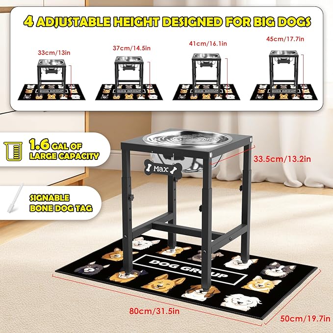 1.6 Gallon Elevated Dog Water Bowl for Large Dogs, 4-Height Adjustable (13–18'') Raised Stainless Steel Bowl with Spill-Proof Mat & Sturdy Metal Stand, Easy-Clean Feeder for Indoor/Outdoor Use