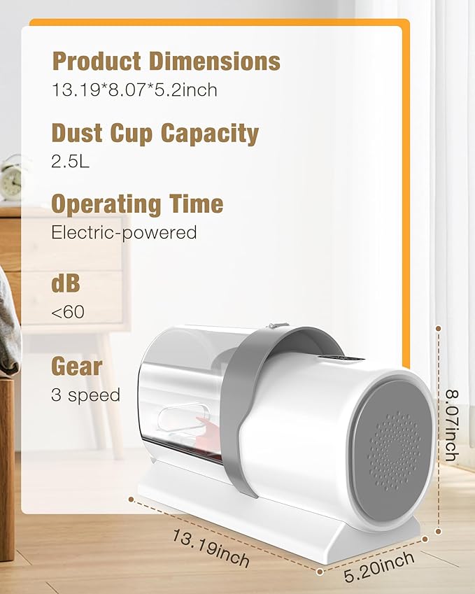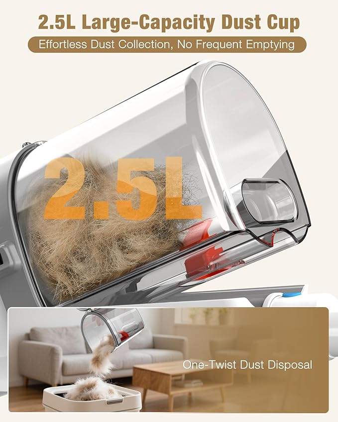 - 2.5L Large Dust Cup & Hassle-Free Cleaning:The upgraded 2.5L dust container holds more pet hair and debris, allowing for extended grooming sessions without frequent emptying. A one-click release system makes disposal quick, hygienic, and mess-free — perfect for multi-pet families or professional groomers.