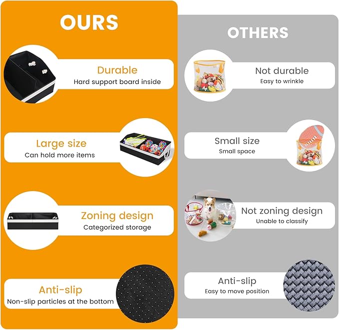 - Excellent Function: The dog toy basket large has rubber anti-slip particles to prevent it from sliding on the floor, making it suitable for different types of floor or shelves. This dog toy bin also features a handle for easy portability, allowing you to move it easily. When not in use, the stair basket only takes a few seconds to fully fold it and store it in anywhere. Not only can this product be used to store pet supplies, it can also be used to store anything you want.