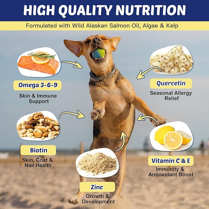 - Pure & Powerful Nutrient Blend: Formulated with high-grade Omega-3s (EPA & DHA) from Wild Alaskan Salmon Oil, Algae, and Kelp. Plus Vitamins C & E, Quercetin, Biotin, and Zinc - all in a bite-sized form to nourish skin, coat, and overall wellness