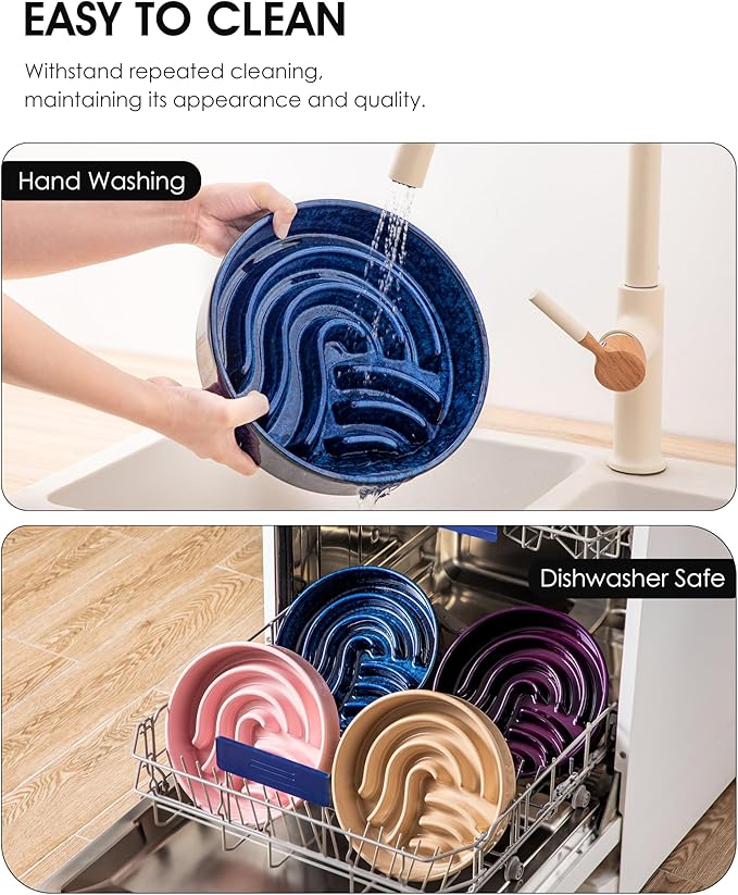 - 🐾【EASY TO CLEAN & DISHWASHER SAFE】The seamless glazed surface prevents food from sticking and allows for effortless cleaning. This slow feeder bowl is dishwasher safe for ultimate convenience.