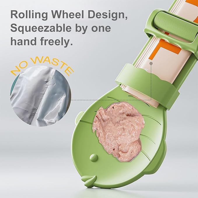 - WITH ROLLING WHEEL ON SPOON,Much Easier to Squeeze. The most advantage of this cat treat feeder is it with wheel squeezer,which makes process much easier,no problem for one hand to feed one kitten.