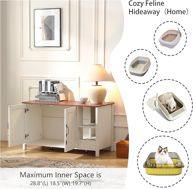- 1)【Multifunctional Uses of cat litter box enclosure】We incorporate a dividing panel within the cat litter box enclosure, which not only serves to deter dogs but also provides a platform for placing cat items, thereby enhancing convenience when accessing
