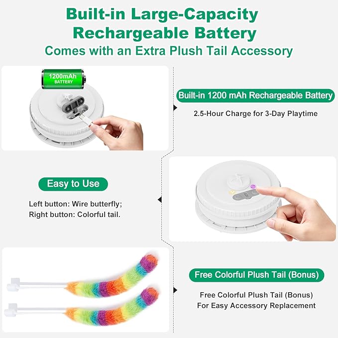 - 【3 Adjustable Speed Modes】Customize the excitement with separate buttons for the butterfly and tail! Choose from 3 settings: Steady (Blue Light), Active (Purple Light), and Random (Yellow Light). Ideal for high-energy cats to burn off steam or for calm cats to enjoy gentle play. Keep your feline entertained and prevent boredom, especially when they are home alone.