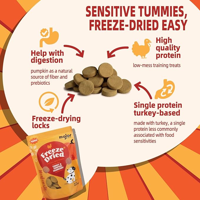 MAJOR PETS Freeze Dried Turkey & Pumpkin, Cranberry Dog Treats, Single High Protein, 100% Natural, Help with Digestion, Grain Free, Training Bites & Meal Topper for Dogs, Made in The USA, 10oz