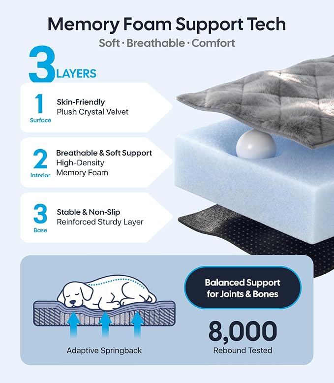 - 【Memory Foam Filling – Cloud-Like Cushioning】 We use high-density memory foam that contours to your dog’s body, delivering plush comfort without losing shape. The skin-friendly cover adds extra softness, while the foam core ensures long-lasting resilience and balanced support.