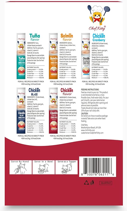 - FUN TO FEED & EASY TO SERVE: Squeeze directly from the tube to bond with your cat, or use as a meal topper or medication helper. Available in five irresistible flavors cats crave: Chicken, Tuna, Salmon, Chicken & Cranberry, and Chicken & Krill.