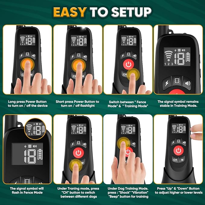 - 【Thoughtful & Safe Design】The wireless transmitter boasts a handy strap for easy portability and a built-in flashlight for nighttime assistance. The electric fence collar is adjustable, fitting dogs with neck sizes ranging from 8 to 28 inches and accommodating weights between 10 and 110 pounds. It includes four conductive contacts: two small for short-haired dogs and two large for long-haired dogs. Additionally, four silicone caps provide extra protection. Crafted from reflective fluorescent TPU, the electric collar enhances your dog's nighttime visibility and safety.